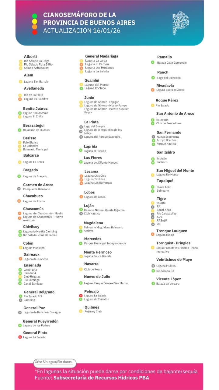 Recordamos que el Cianosemáforo es una herramienta de alerta temprana puesta en marcha por la Subsecretaría de Recursos Hídricos bonaerense y actualiza diariamente la situación en distintos espejos de agua de la provincia para que bañistas y vecinos puedan informarse antes de usar áreas recreativas acuáticas.