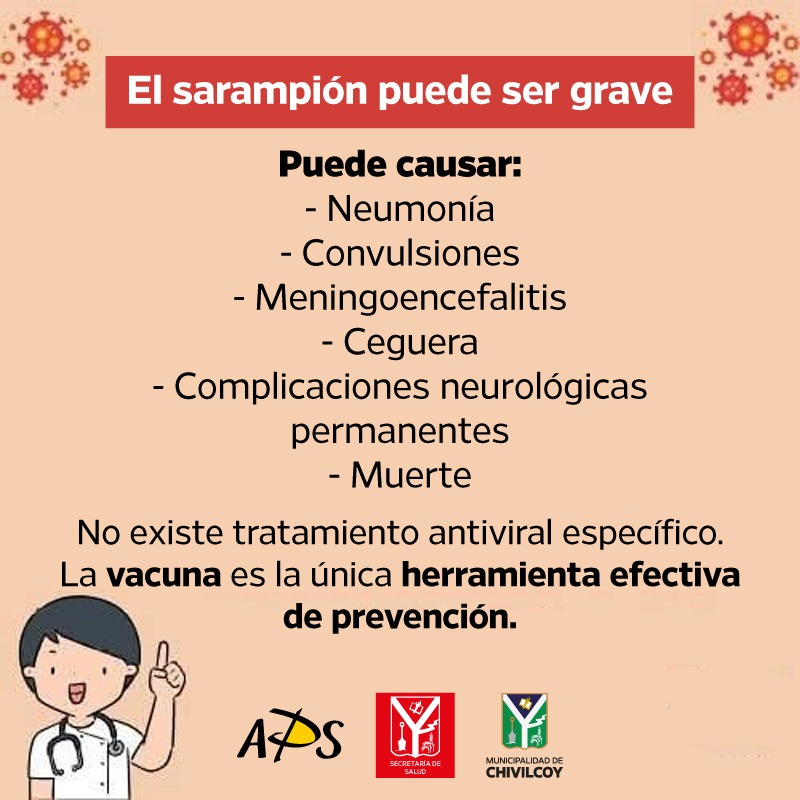 El sarampión es una enfermedad altamente contagiosa que puede provocar complicaciones graves como neumonía, convulsiones, meningoencefalitis, ceguera, secuelas neurológicas e incluso la muerte. No existe tratamiento antiviral específico, por lo que la vacunación es la única herramienta eficaz de prevención.