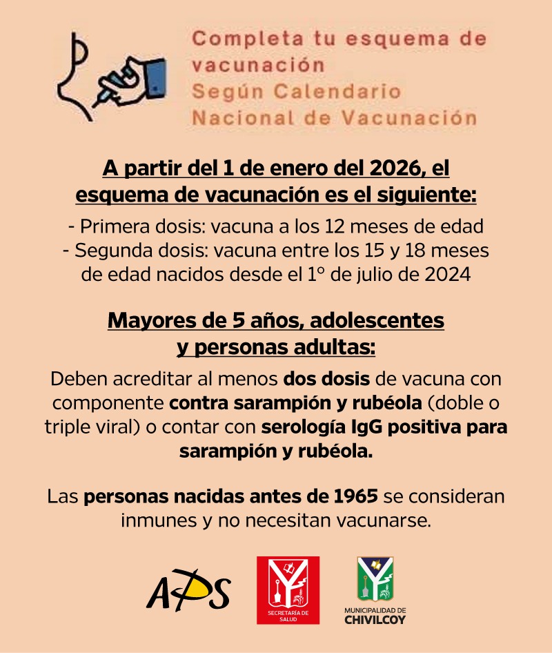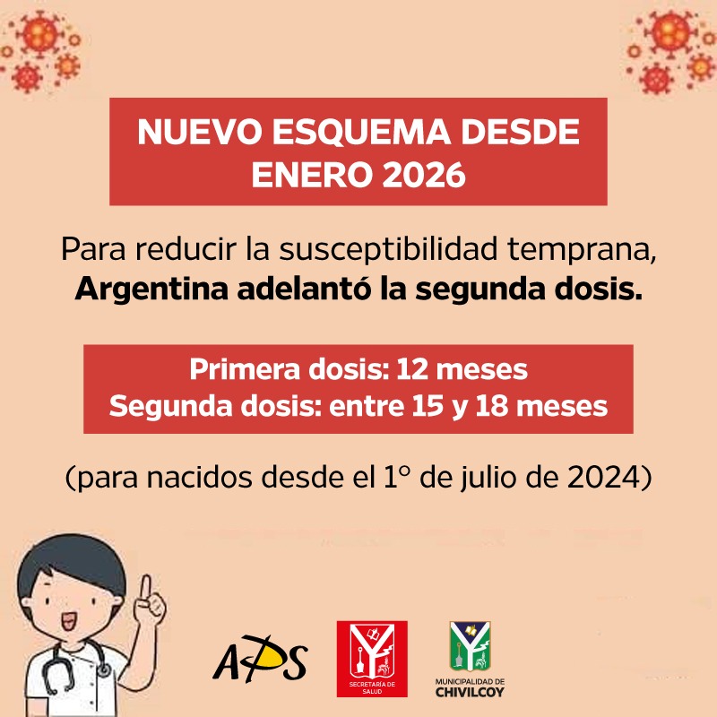 Desde el 1 de enero de 2026, la segunda dosis de la vacuna triple viral se aplica antes de lo que establecía el calendario anterior. El esquema quedó definido de la siguiente manera: la primera dosis a los 12 meses de edad y la segunda entre los 15 y 18 meses, para niños nacidos desde el 1 de julio de 2024.
