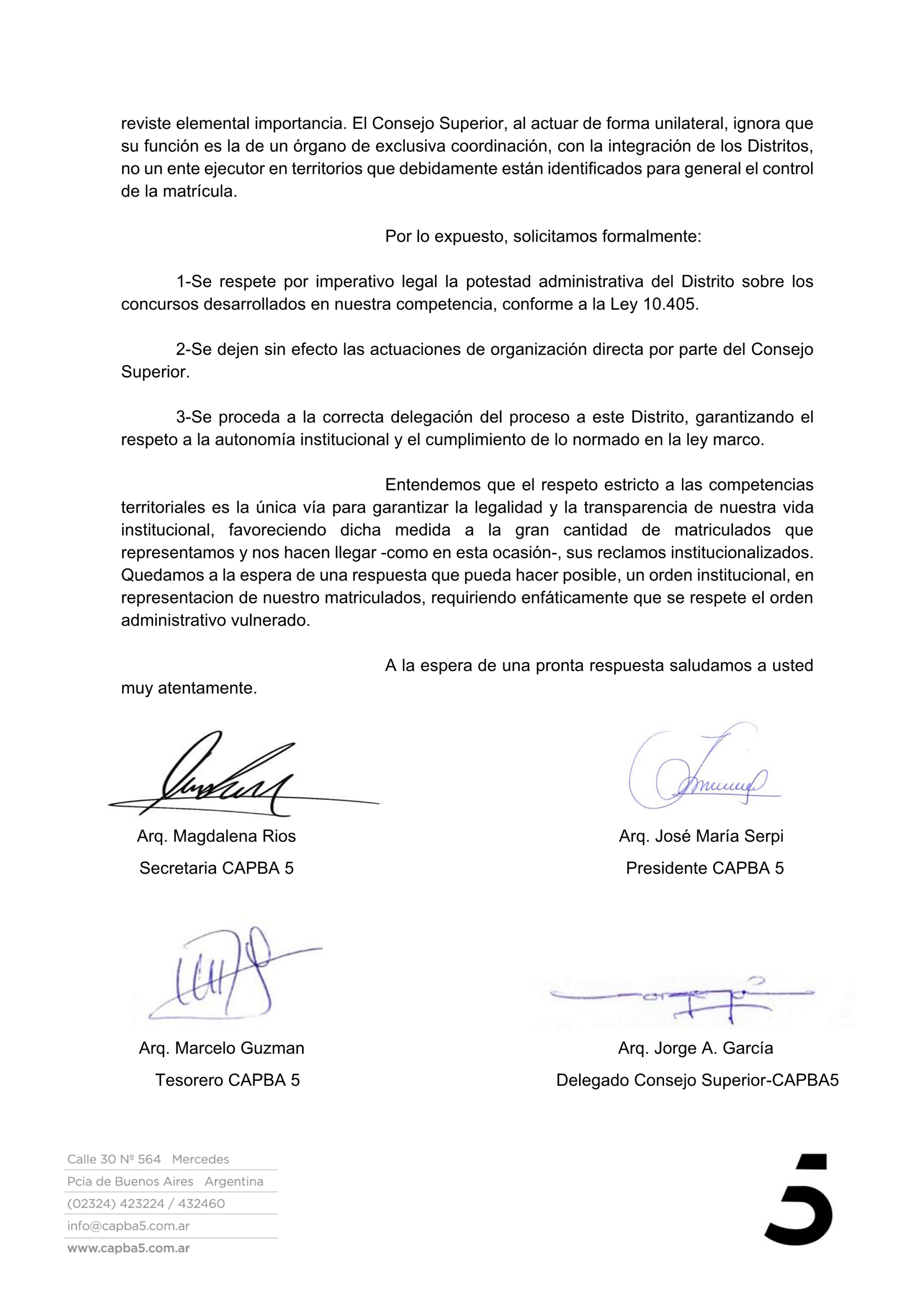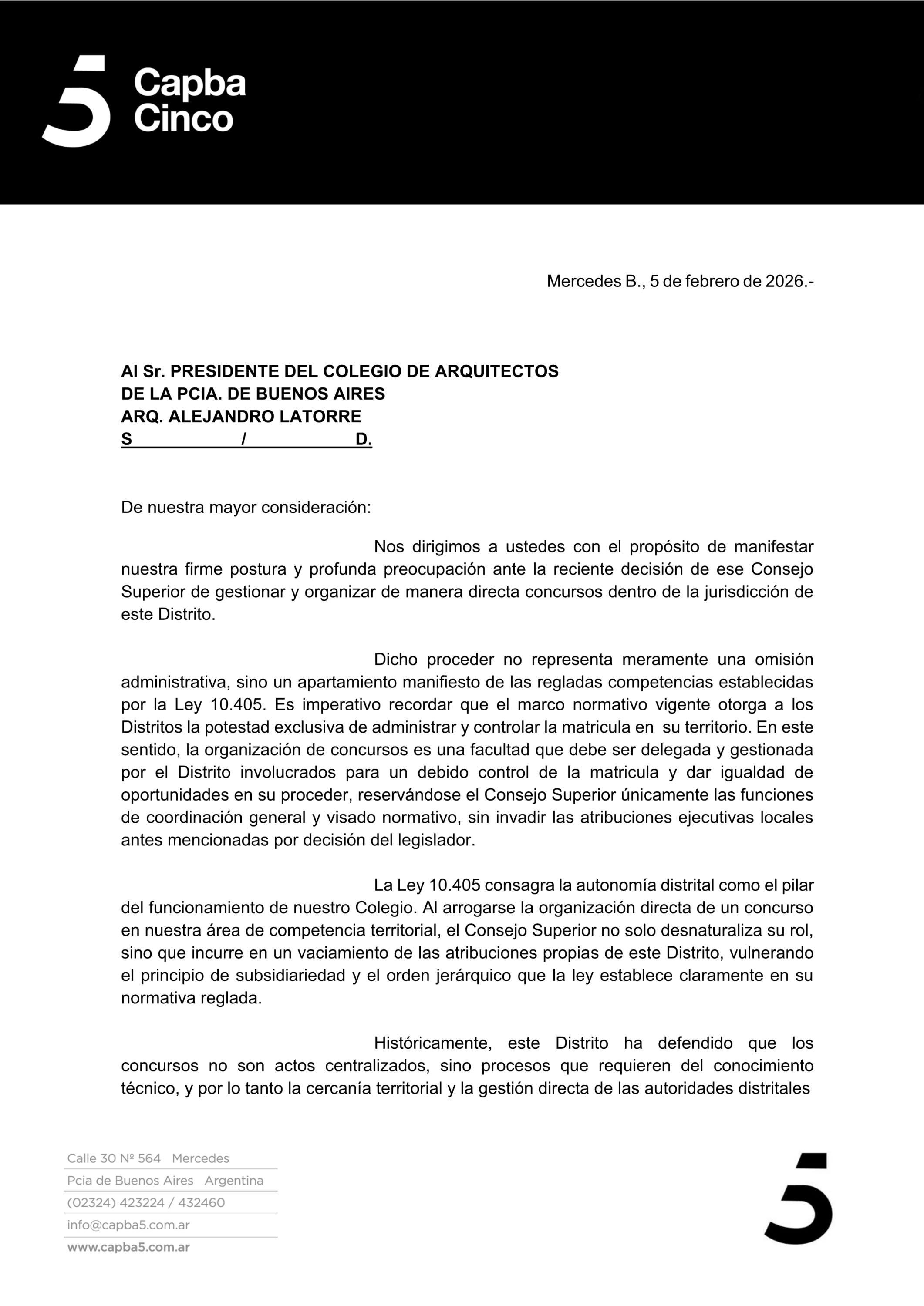 El Colegio de Arquitectos de la Provincia de Buenos Aires – Distrito 5 informó que, con fecha 5 de febrero de 2026, sus autoridades elevaron una nota formal al presidente del Consejo Superior, Alejandro Latorre, para manifestar su postura y preocupación ante la decisión de ese organismo de gestionar y organizar de manera directa concursos dentro de la jurisdicción distrital.