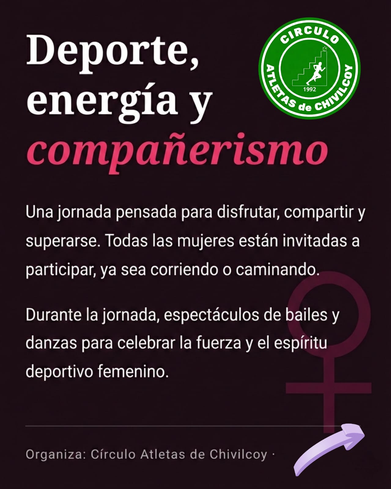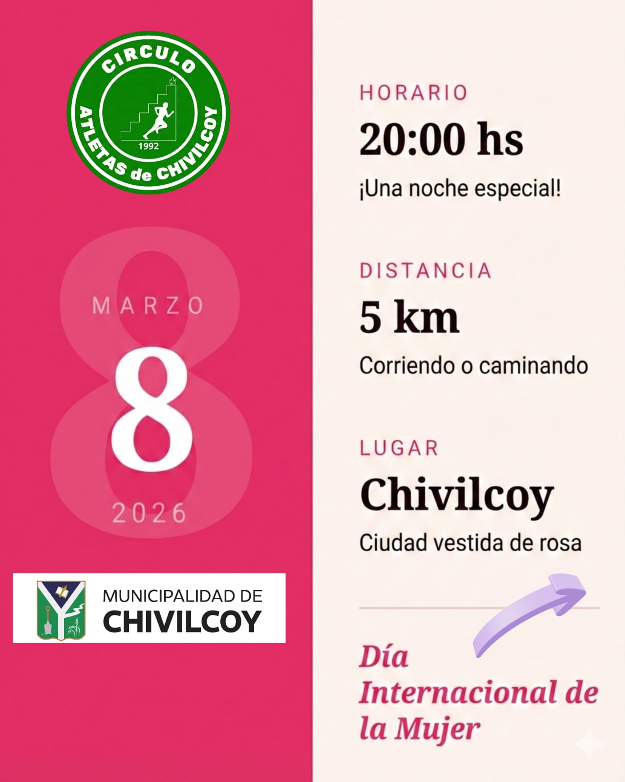 En el marco del Día Internacional de la Mujer, el próximo domingo 8 de marzo a las 20 horas se llevará a cabo la Carrera de la Mujer 5, con largada frente al Palacio Municipal. La propuesta es organizada por el Círculo de Atletas de Chivilcoy, junto a la Municipalidad de Chivilcoy.