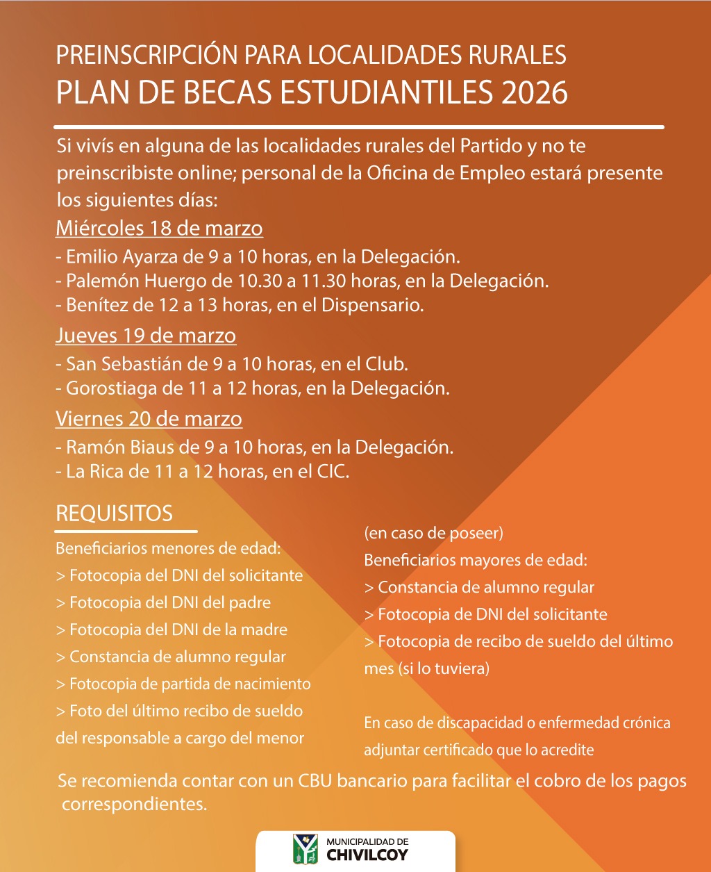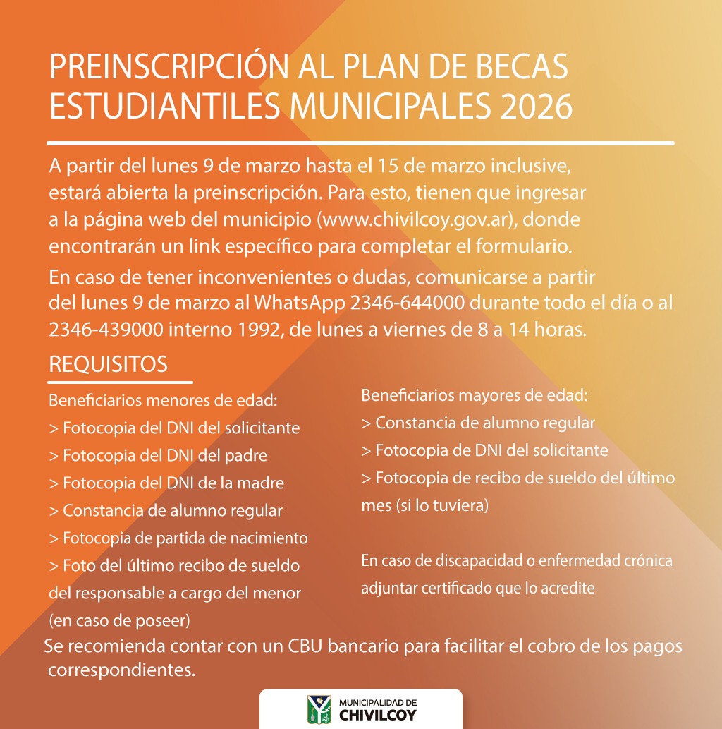 El trámite se realizará de manera online entre el 9 y el 15 de marzo. Entre los requisitos, se establece que los aspirantes deben ser estudiantes de alguno de los niveles mencionados en instituciones públicas y acreditar una residencia mínima y continua de dos años en el Partido de Chivilcoy.