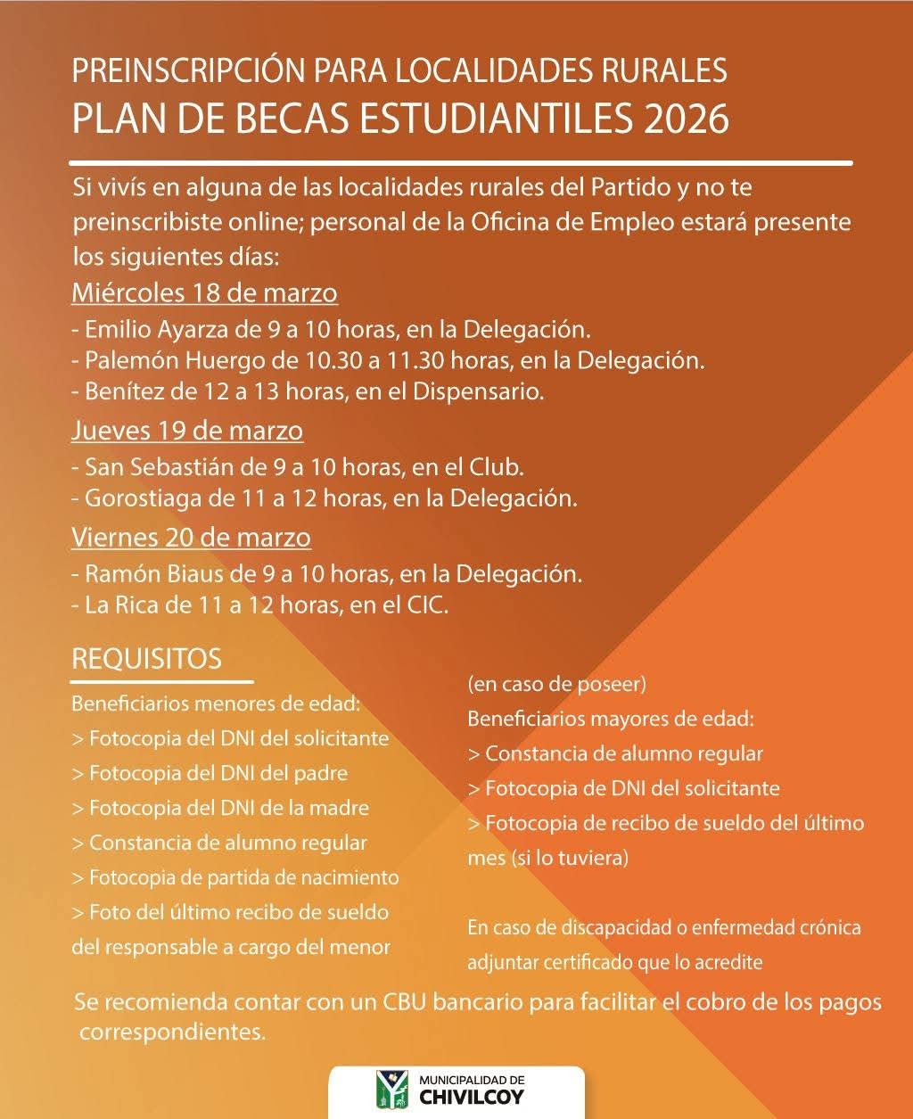 Si vivís en localidades rurales de Chivilcoy y no te preinscribiste online, personal de la Oficina de Empleo estará recorriendo distintos puntos esta semana para completar el trámite. 📍 Habrá atención en Emilio Ayarza, Palemón Huergo, Benítez, San Sebastián, Gorostiaga, Ramón Biaus y La Rica, en días y horarios establecidos. 📄 Recordá llevar la documentación requerida según corresponda. 👉 Acercate y no pierdas la oportunidad de acceder a las becas.